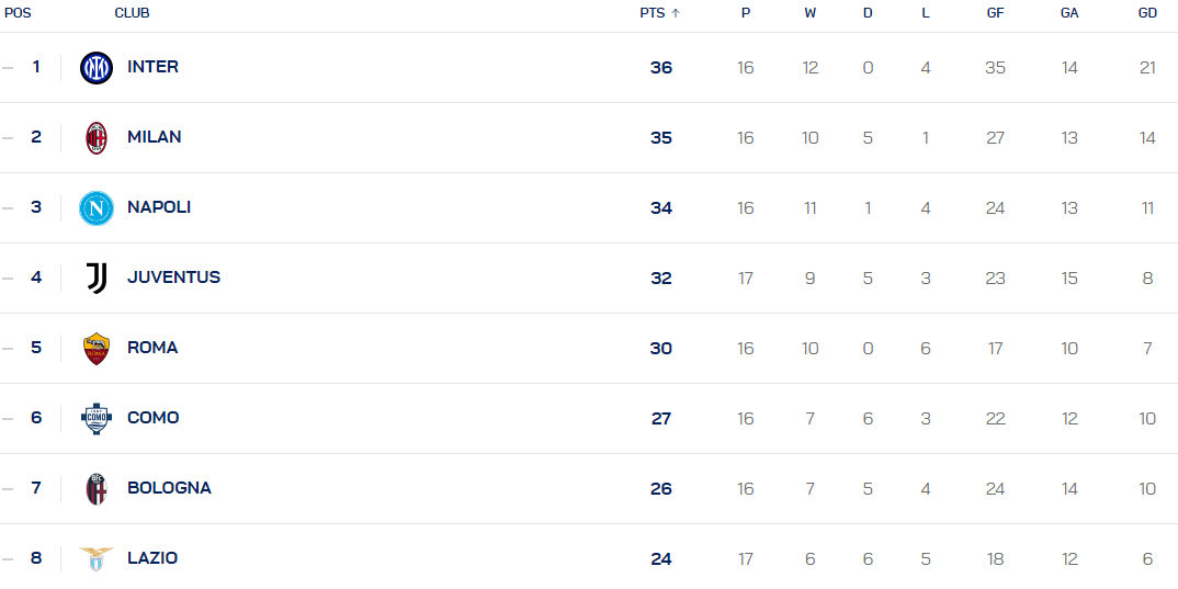意甲积分榜:后赛国米手撕米兰榜首体验 只差1分看罗马